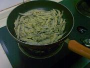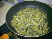 平锅中放入少许底油,待油五分热将裹好玉米面的小麦穗均匀铺在锅中,一次不要量太大,要不鱼容易碎了。一斤大概分2-3次煎熟。然后改中小火慢慢煎熟。(要用筷子一条条轻轻翻动,以防鱼断裂)。