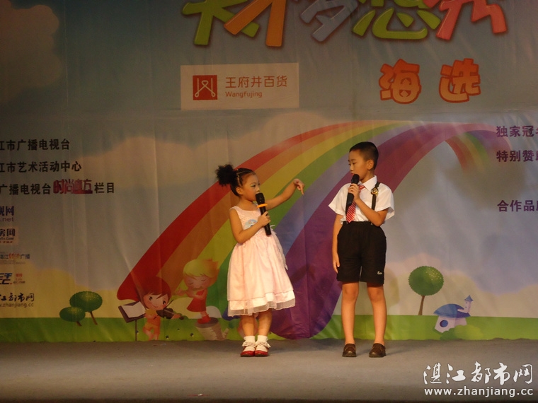 这么热闹的活动怎么少得了爱凑热闹的我呢。天真烂漫的孩子,满怀鼓励的家长,热闹非凡的赛场在我一到现场就吸引住了我的眼球。海选伴随着现场热闹的氛围展开了,可爱的孩子,稚趣的表演让在场的大人们忍俊不禁,也博得了在场评委与观众的阵阵掌声。赛事中途评委进行点评,评委老师认为孩子们的表演应该是天真可爱的,而上半场孩子们却少了一分笑容,多了一分紧张。这次点评为下半场的赛事提供了极好的参考。在下半场的比赛中,孩子们放松心情,笑得更欢了,舞得更美了,唱得更动人了。孩子们才华横溢,在这个下午大放异彩,让我也被现场的气氛感染了,这才是这个年龄的孩子们应该有的风华,这才是湛江真正的希望与未来。