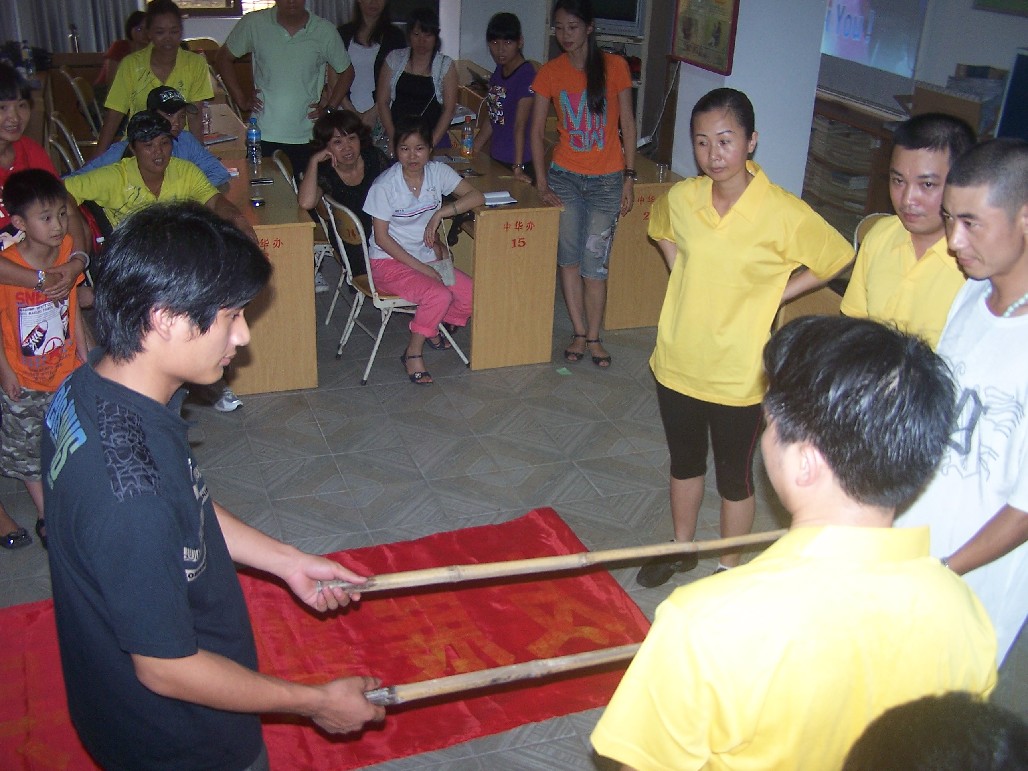 人民医院的志愿者们在演示制作简易担架