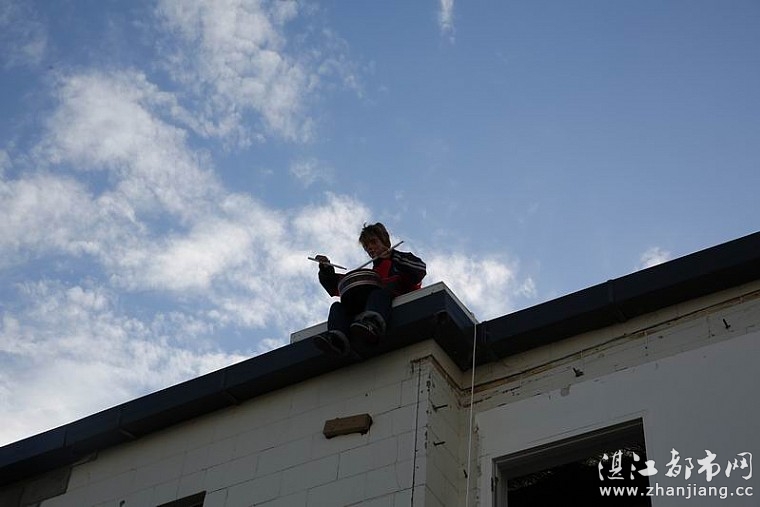 残败的屋顶上木偶孩童孤独地敲着铁皮鼓