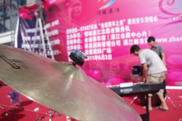 今天在准备的时候,我们的乐队成员们都在很细心地一遍遍地检查调试音响,相信一定会带给大家一个愉快的夜晚的,大家明天记得去捧场啊!
