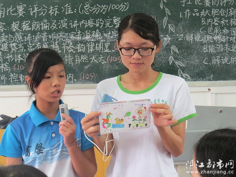 比赛上,参赛选手先向老师和同学们展示自己的作品,他们心灵手巧的纯手工创作是自然的,是积极向上的,是有利于师生身心健康发展的,他们指尖流露出的色彩更是参赛者们无限的灵感与创新;接着参赛选手对作品进行解说,他们的解说不但流利,并且准确地表达出了作品中每一重要细节的深刻意义及创新灵感,学生们的作品和解说既有感染力也有震撼力。