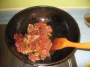 肉炒变色后,将肉片推至一边,放入豆瓣酱与豆鼓煸炒。