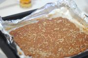 烤箱180度预热,正面刷蜂蜜,撒芝麻烤15分钟,然后将反面放烤网上,刷蜂蜜,撒芝麻继续烤15分钟至肉变干即可。(如图这张还没烤好,烤了一半时的样子,烤好后会缩很多)