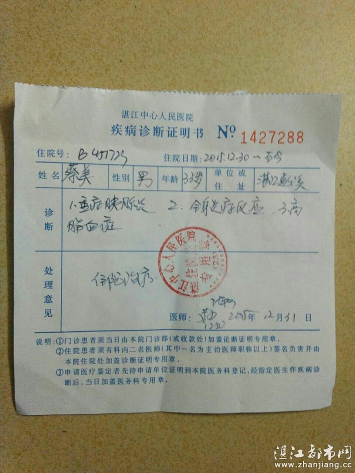 - [2016-01-04]请大家帮帮我,三个孩子的父亲不能倒下此求助信息为家人代写,我丈夫是湛江市遂溪县河头镇新市村人,一家5口在湛江市开发区以卖水果为生,育有两男一女,最大的10岁,最小的才3岁,还有70多岁的父母需要抚养。 我丈夫从去年开始就觉得肚子有点隐隐作痛,一开始以为是脂肪肝引起,不是很在意。突然12月28日下午剧烈疼痛,实在忍不住去了湛江市第二人民医院做检 查,12月29日结果出来,为重症胰腺炎,已经影响到其他器官,如果不及时有效医治会导致生命危险。湛江市第二人民医院不敢再接收医治,建议转到湛江市赤 坎中心人民医院,现在还在icu重症病房,医生告知医药费至少得40万以上,每天医药费支出至少20000元,这个噩耗让本来就贫穷的家庭更是雪上加霜。 由于本来收入就少,加上3个孩子需要抚养,手头基本没有积蓄,现在通过亲戚朋友临时凑了2万多元,对于巨额的医药费这点钱只是杯水车薪,支付完押金后所剩 无几了。 希望通过网络平台向社会求助,让三个孩子的爸爸,家庭的顶梁柱尽快恢复,早点回家跟家里人团聚,相信有大家的帮助,我们一定能够度过这个难关! 感谢社会各界人士伸出援助之手,好人有好报,无论捐献资金多少,救人一命,胜造七级浮屠! 病人情况进展:病人体征还未稳定,还继续留在icu病房观察,由于所需药物都很昂贵,现在每天费用需要2万以上,如果正常后到普通病房最少也要住院1-2个月,并且不能进食,这块费用还是需要巨大,感谢好心人的关注和善行,好人有好报,感谢! 本人联系电话:钟冬菊,15975996202 治疗医院:湛江市赤坎中心人民医院楼icu房4号床。 中国邮政银行卡号: 6217995800024970687(账户名:钟冬菊)