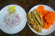 泡发好的竹笋切成片,胡萝卜去皮洗净切成花刀,洋葱切丁,姜切片。