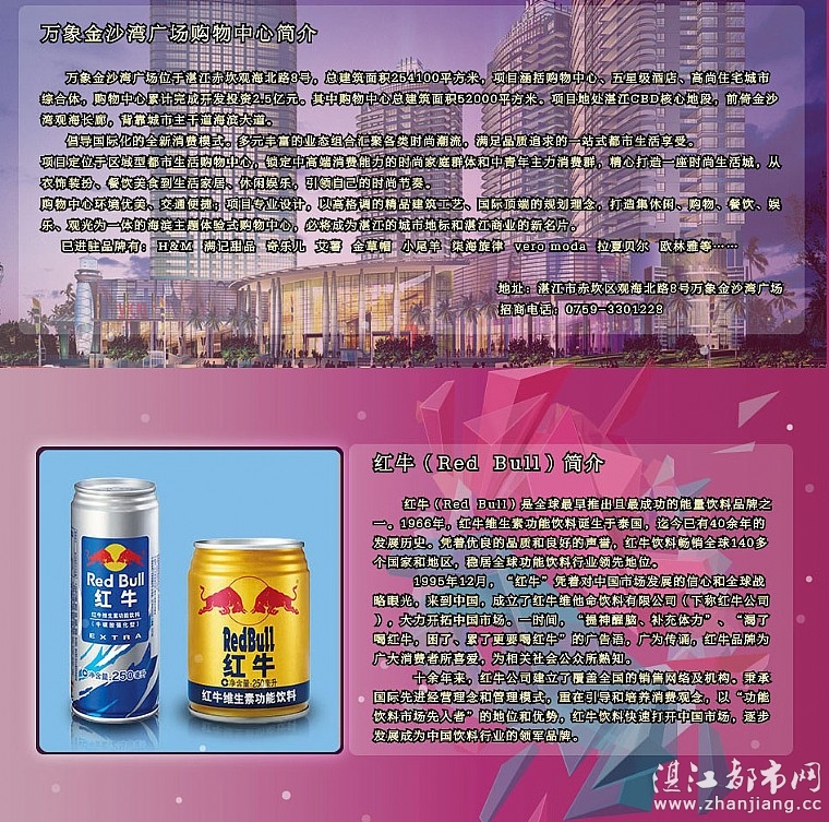 阅读(7581) 回复(7) 查看全文>> - [2013-06-29]2013湛江万象金沙湾广场go青春音乐节万象金沙湾广场首次粤西地区最大阵容音乐人聚集与首次湛江轻人喜欢元素集中营 万象金沙湾广场铸造高端奢华的生活圈,湛江城市休闲时尚的新地标!万象金沙湾广场购物中心总建筑面积52000平方米,拥有高达45层的五星级花园酒店,负一至四层,集休闲、购物、餐饮、娱乐、观光为一体的海滨主题体验式购物中心,这里将会成为湛江城市休闲时尚的新地标!