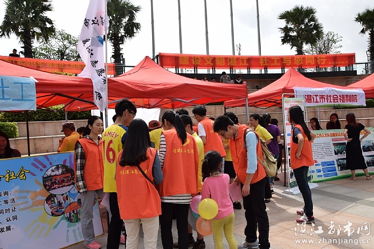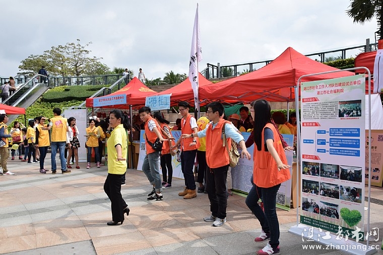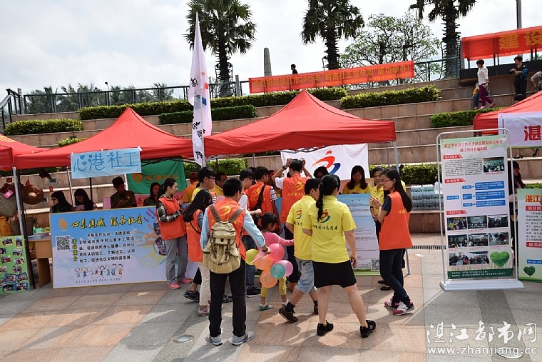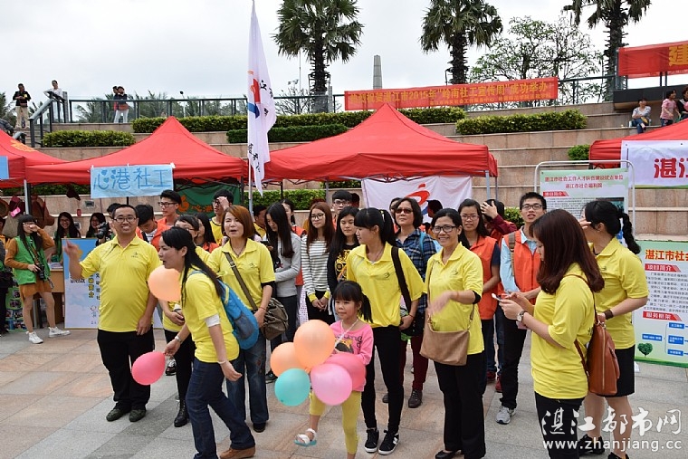 - [2015-03-29]湛江市“岭南社工宣传周”活动会上的“情暖湛江”志愿者2015年3月29日,由湛江市民政局主办的动“建设文明湛江,社工与您同行”为主题的湛江市“岭南社工宣传周”活动会在赤坎金沙湾广场举行,来自湛江本地的众多社工(志愿者)团体参与了当天的活动会,通过展板、图片、宣传小册子等各种方式向广大市民宣传社工服务理念,扩大本地社工(志愿者)团体的影响力,得到市民的热烈响应。 作为粤西地区民间最早成立的志愿者队伍--“情暖湛江志愿者协会”在活动会上,主动与各社工(志愿者)团体交流志愿者故事和心得,分享志愿服务中的快乐,“情暖人”在活动现场还跳起了市民熟悉的“小苹果”,引来了现场市民的阵阵掌声。