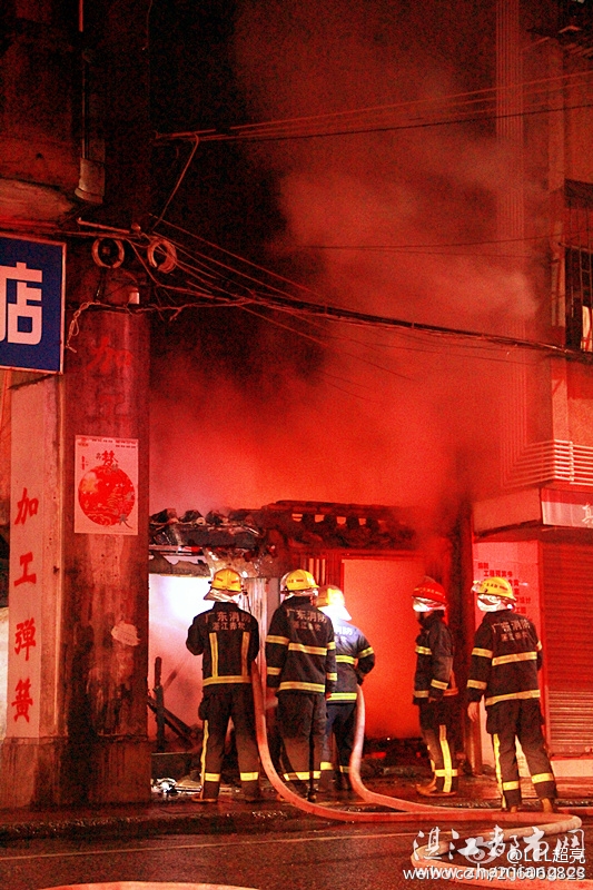 - [2015-01-14]赤坎一店失火,邻居拍门叫撤1月12日早上五点四十五分,住在二楼的李先生听到楼上邻居的拍门声,叫醒他说:“后面幸福路的卖鸡蛋店着火啦!大家快起床暂时先撤退吧!”听到提醒后,李先生与家人迅速反应,与家人移步到火灾现场。李先生发现发生火灾的是幸福路的卖鸡蛋店,消防官兵这时已经及时赶到现场救火。李先生告诉记者,五楼的邻居被一股焦味和烟雾呛醒,经发现后,是处于后面的幸福路卖鸡蛋店发生火灾引起的烟雾直冒上他们家里的窗户,渐渐火势蔓延,撤离时,在楼梯间也能明显看到那里的红色火光。李先生表示,自家楼房附近都是旧居民房,存在一定的安全隐患。引发事故的原因估计是天干物燥或遇到易燃物品,所幸现场无人受伤,店内无人,但屋檐已烧塌,墙体和周围已烧焦。消防官兵扑灭火灾后搜出煤气瓶,再进一步调查故现场。 摄影:李超亮