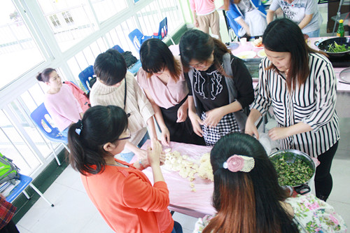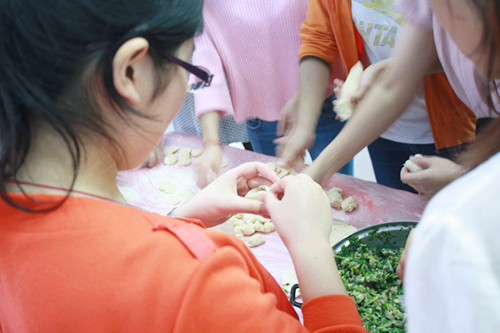 很快地,面团在同学们的手下被擀得平坦而成块状。当馅料也准备齐全,大家就开始包饺子了。