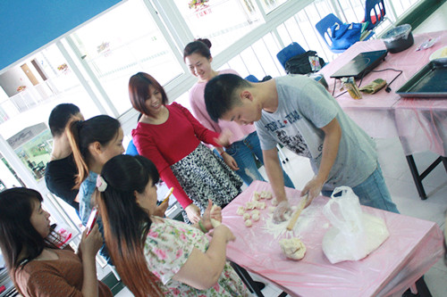 镜头回到教室,看,包饺子的同学已经开始忙活了。水与面粉的融合,这是和面阶段。
