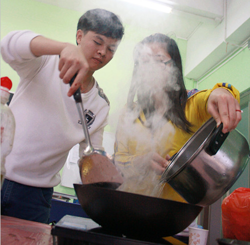 锅内锅外烟气弥漫,同学们齐心协力,共同煮好一锅汤。