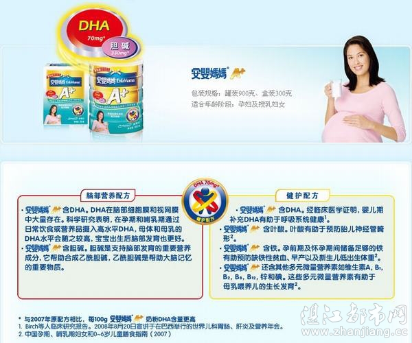 孕期营养,不但关系母体健康,更影响胎儿的生长发育,授乳期的母体营养直接影响泌乳量和母乳的营养品质。DHA是胎儿及婴儿脑部及视力发育所需的重要成分。安婴妈妈考虑到胎儿的生长发育和孕产妇的营养需要,特别添加了DHA。另外,安婴妈妈含充足的蛋白质,适量的脂肪,并强化了钙、铁、叶酸和维生素B、C等重要的矿物质和维生素。
