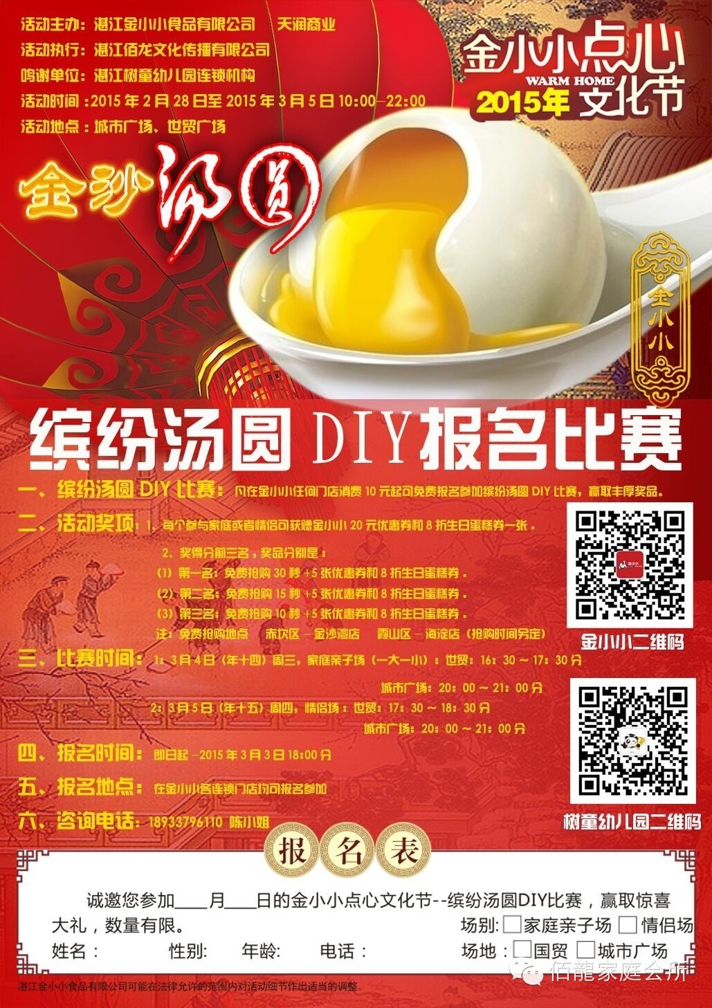 六、报名联系:189 3379 6110 阿滢(电话&微信号)咨询报名联系,齐参与家庭亲子缤纷汤圆DIY比赛,赢取丰厚礼品。 七、缤纷汤圆DIY比赛流程:总分100分 1、开场律动:参与比赛者自我介绍(20分) 2、猜灯谜与有奖问答:(20题20分) 参与比赛者问题回答,在五分钟回答问题,一题一分,答对加分,答错不加分不扣分。 3、美食之旅:汤圆DIY(DIY后的汤圆带回家和家人分享哦)(60分) 参与比赛者在规定五分钟时间内,DIY动手制作汤圆,每一颗的重量标准范围是12g-15g,高于或低于重量标准都视为不符合,不加分不扣分,符合重量标准则加分,一颗两分,累计积分。 4、累计四项总分,参与龙虎榜挑战,评冠军一名,亚军二名,季军四名,关注金小小微信公众号,留意比赛精彩动态。 5、留下精彩:合照,活动结束。 八、活动奖项: 1、 每个参与家庭可获赠金小小的20元的现金优惠券和8折生日蛋糕卡一张 2、 奖得分前三名,奖品分别是: (1) 第一名:免费抢购30秒+5元现金券和8折生日蛋糕卡一张 (2) 第二名:免费抢购15秒+5元现金券和8折生日蛋糕卡一张 (3) 第三名:免费抢购10秒+5元现金券和8折生日蛋糕卡一张