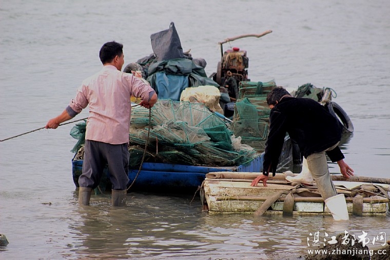 金沙湾水闸旁多有船只,渔民正整理网具,清洗、维修机器。问岸上所晒方形塑料网编织的笼子为何物,答,乃捕鱼工具。