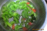 西芹去外皮,据说这样炒会更脆。水氽一下,然后放在冷水中,也是为了炒出来脆并颜色鲜艳。