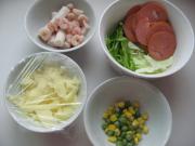 利用中间空闲的时间可以来准备材料喔~玉米粒、青豆、青椒切丝儿、火腿切片、蟹肉棒,虾仁(去掉虾线),马苏里拉奶酪切薄片或刨丝。ps:图中有包菜,实践证明放青菜类容易出水,不推荐。