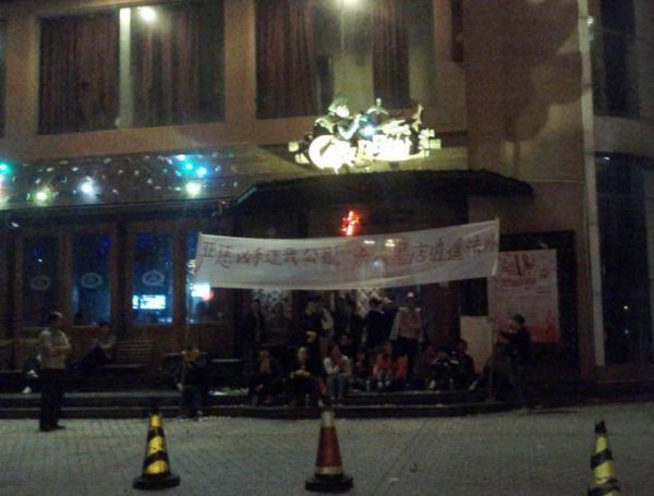 23日的晚上加勒比酒吧门口被堵,一群人拉横幅示威:严惩凶手还我公道,杀人黑店逍遥法外……