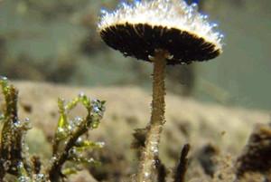 图7 水下蘑菇物种这个褶菇被发现淹没在俄勒冈州罗格里弗河流上游长达11周。这种名为Psathyrella aquatica的真菌是首个水下生成果实体的蘑菇物种。