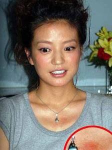 以性感姿态和浑然天成的可爱魅力出击的徐若瑄,在《幸福人100号》接受陶子专访时,现场记者发现她胸前有片片红色的印迹,不知是不是未来的老公留下的吻痕?