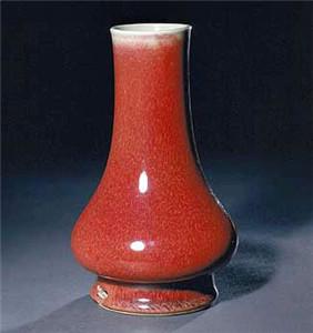 郎窑红釉穿带直口瓶,清康熙,高20.8cm,口径6.1cm,足径9.1cm。瓶直口,长颈,垂腹,圈足外撇。足外墙两侧各有一长方形穿孔,可穿系绳带。在容器上系带是对无梁、无系、无扳手的器物进行提拿的传统方法,拆卸容易而又非常实用,也可以使器物在摆放位置上固定,不致被损坏。明高廉《遵生八笺》中记载:“故官哥古瓶,下有二方眼者,为穿皮条,缚于几足,不令失损。”该器通体施红釉,因釉质在高温烧造时垂流而使口部显露出白色胎体,底部红釉凝聚,釉色浓重。外底施白釉并镌刻乾隆御制诗:“晕如雨后霁霞红,出火还加微炙工。世上朱砂非所拟,西方宝石致难同。插花应使花羞色,比尽翻嗤画是空。数典宣窑斯最古,谁知皇祜德尤崇。乾隆乙未仲春月御题。”由此可见乾隆皇帝对郎窑红瓷器的喜爱和推崇。