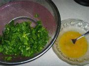 菜心洗净切粒备用,鸡蛋加少许盐、油打散。