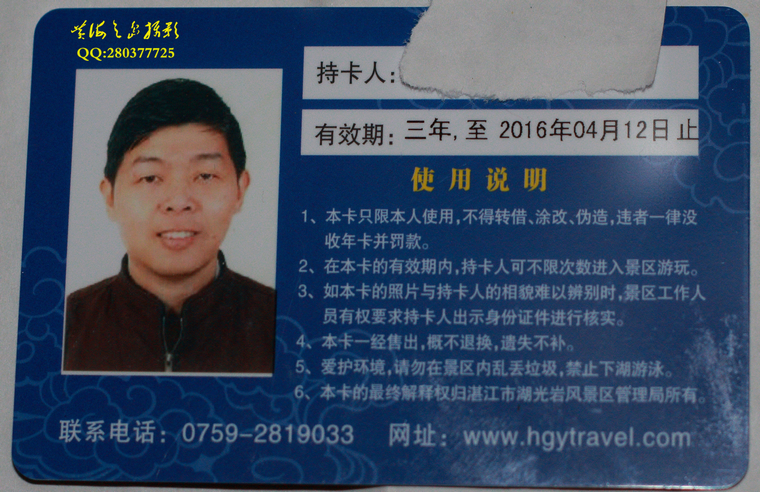 因为我4月13日参加铁三群骑行活动要进入湖光岩,因此,我4月12日下午去赤坎党校办了一张湖光岩门票年卡,收费60元。三年有效期,这三年你去湖光岩是不限次数的。去办证的时候要带一张相片去办理。假如大家时不时有时间去湖光岩玩的,办年卡很划算。