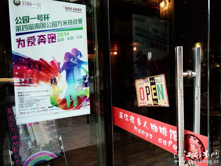 2014年4月11日下午,笔者和“公园一号杯”为爱奔跑第四届南国万米挑战赛的活动策划统筹负责人木言一起来到赤坎3家公园一号杯”为爱奔跑第四届南国万米挑战赛的报名点,包括位于赤坎金沙湾的湛江很多人咖啡馆,还有位于赤坎体育场附近的捷安特自行车赤坎门店,以及位于赤坎汇景酒店内的本子咖啡。