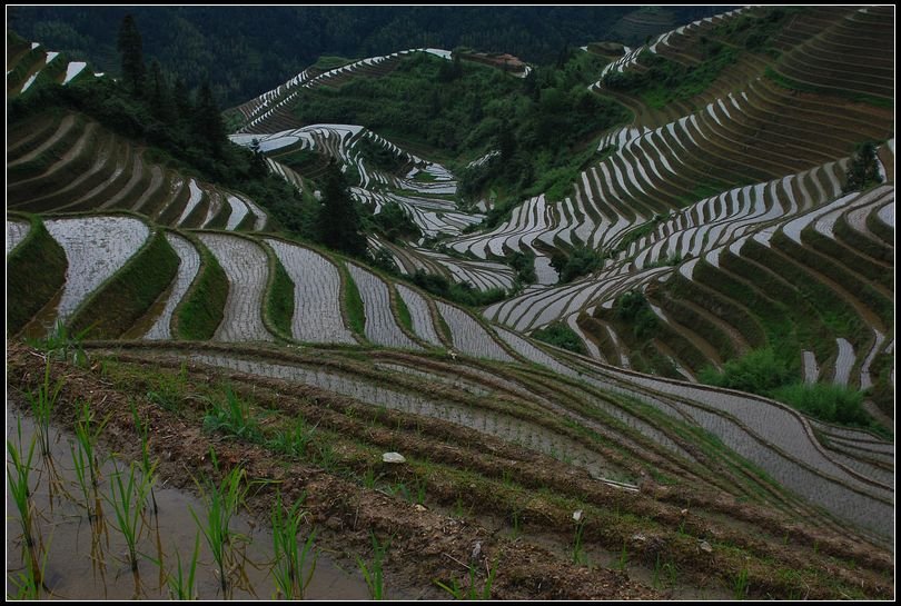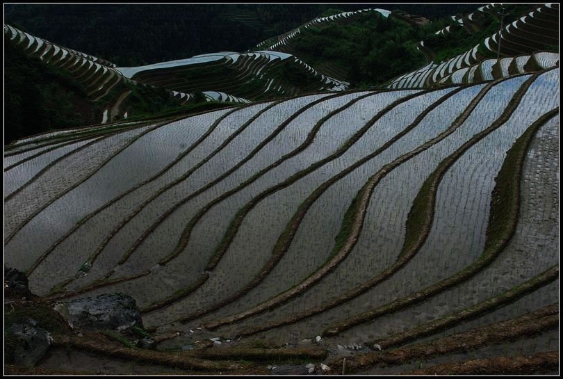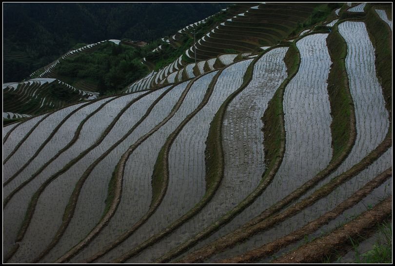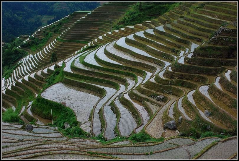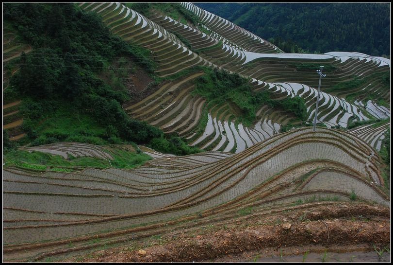 梯田是龙脊的灵魂,是这山野的生命之脉。梯田如云团般地舒卷有致,轻盈秀丽。一个又一个大小不一的山包和土丘被梯田层层环绕,从底部开始是最大的一圈,向上逐层缩小,到顶部出现一个圆圆的平台,大的如华盖,小的似斗笠;山包土丘之间的洼地则一层层向下盘旋,犹如一个个旋涡,像流水挥洒自如,热情奔放。山坡上的梯田依山傍势,重重叠叠,蜿蜒伸向远方,少的数层,多的数十层,长达几十甚至几百米,它们在某个山洼处打了一个折,然后又向另一个方向延伸而去,浩浩荡荡,壮丽无比。