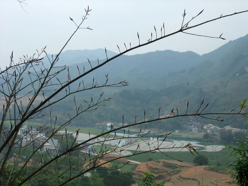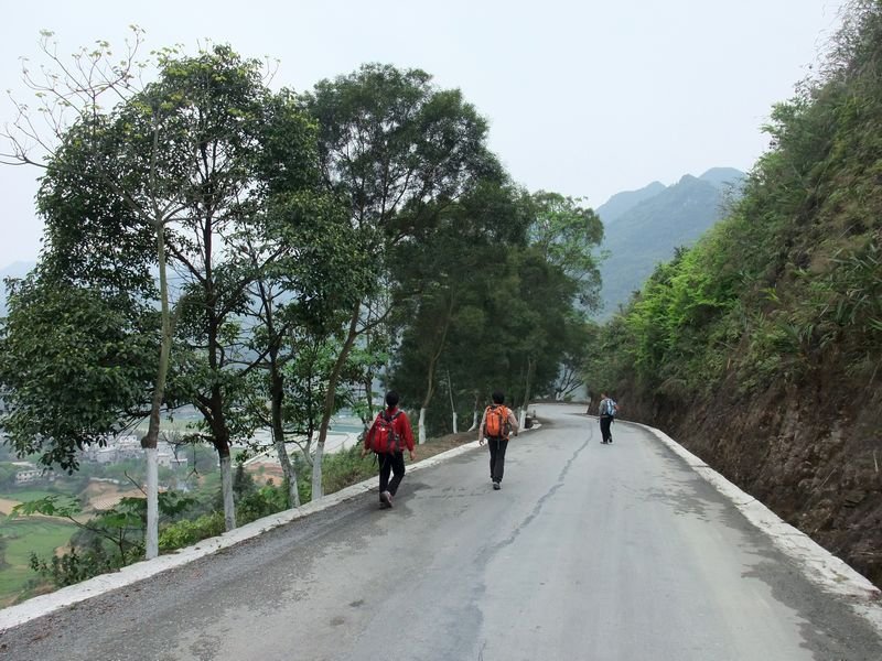 三门海位于凤山县袍里乡坡心村,如果从村口进去三门海还有五公里,我们要求司机搭到较近的另一路口,然后弃车徒步。坐了几小时的车,心里腻的不得了,脚一着地,撒腿就走,那个欢快劲就象金丝鸟出笼。大家呜啦啦的叫个不停:好新鲜的空气,好美的风景呵……笑声在天空中弥漫回荡。