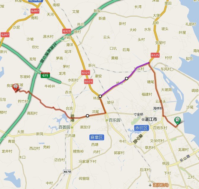 路线:劳丽诗广场——海观路——军民路——海湾路——滨海公园——赤坎水质净化厂——湛江丰源水产有限公司——海田路——G325国道——瑞云北路——金康中路——合流路——金秋食用菌科学研究所——湛江育才学校——麻章香茅场——东坡岭农场——东坡荔园渡假村 (FB)单程30公里。