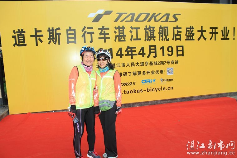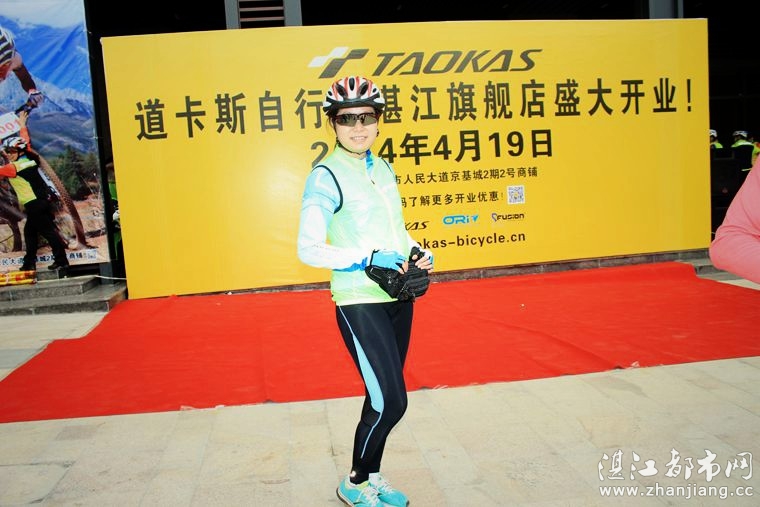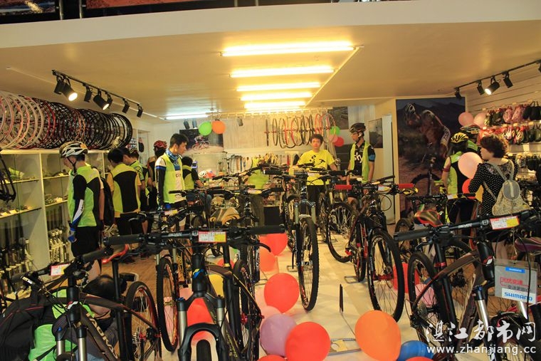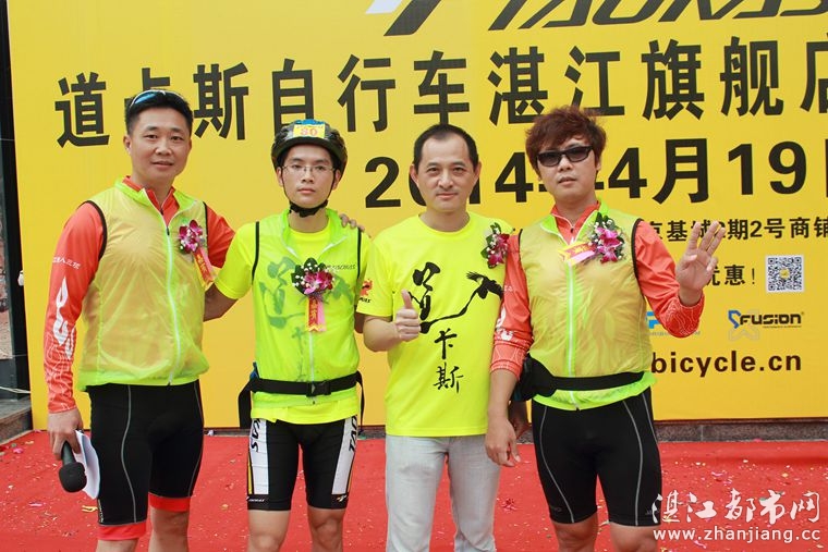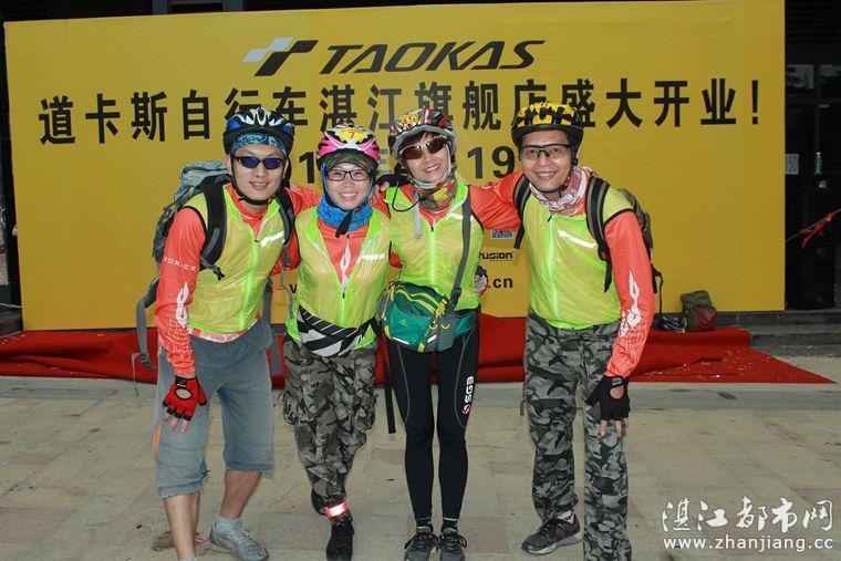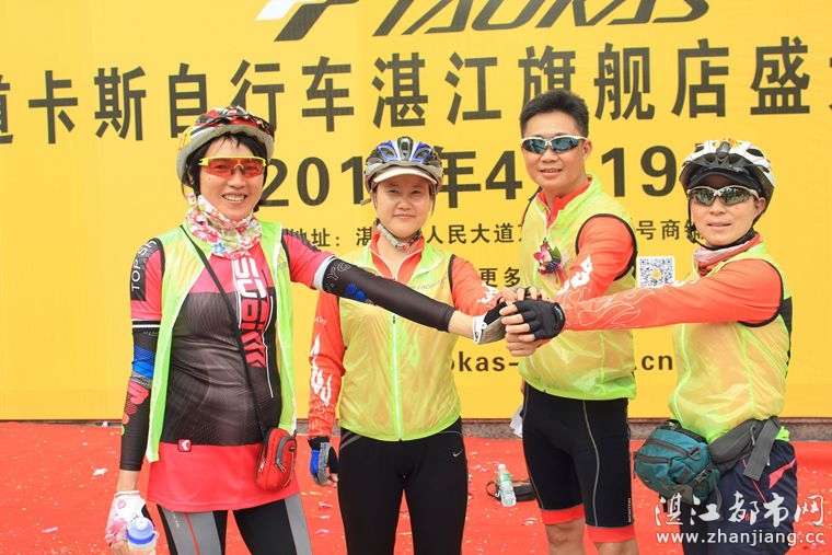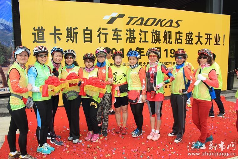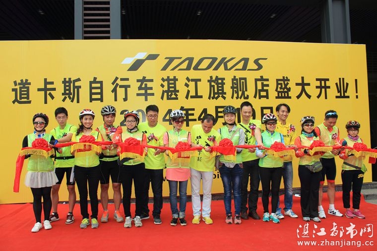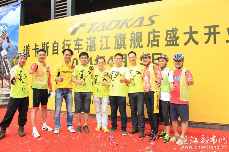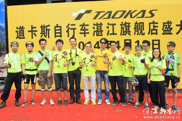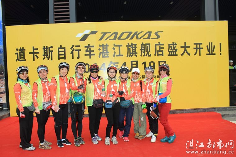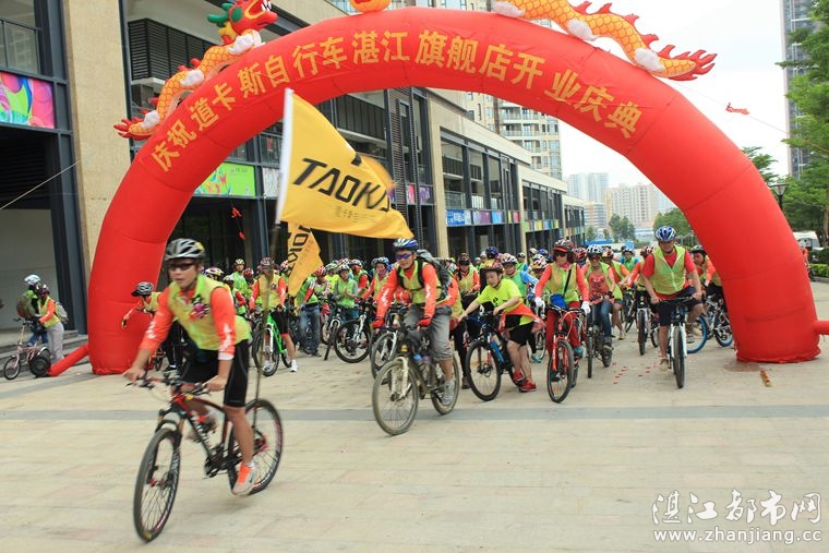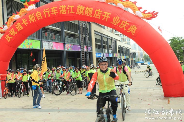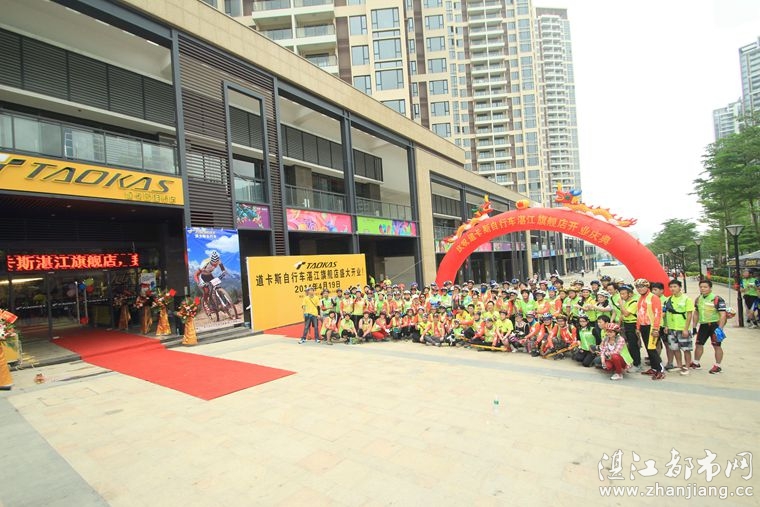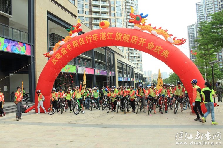 4月19日位于湛江市人民大道京基城2期2号商铺(公园一号对面)道卡斯自行车湛江旗舰店门前聚集着100多名来自湛江铁人三项俱乐部骑友、热血骑兵俱乐部骑友、湛江都市网网友.为道卡斯自行车湛江旗舰店开业庆典祝贺.