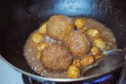 锅内加水、炸好的肉圆、鹌鹑蛋、葱姜、盐、糖、生抽、老抽、蚝油、胡椒粉、鲍鱼汁同煮。